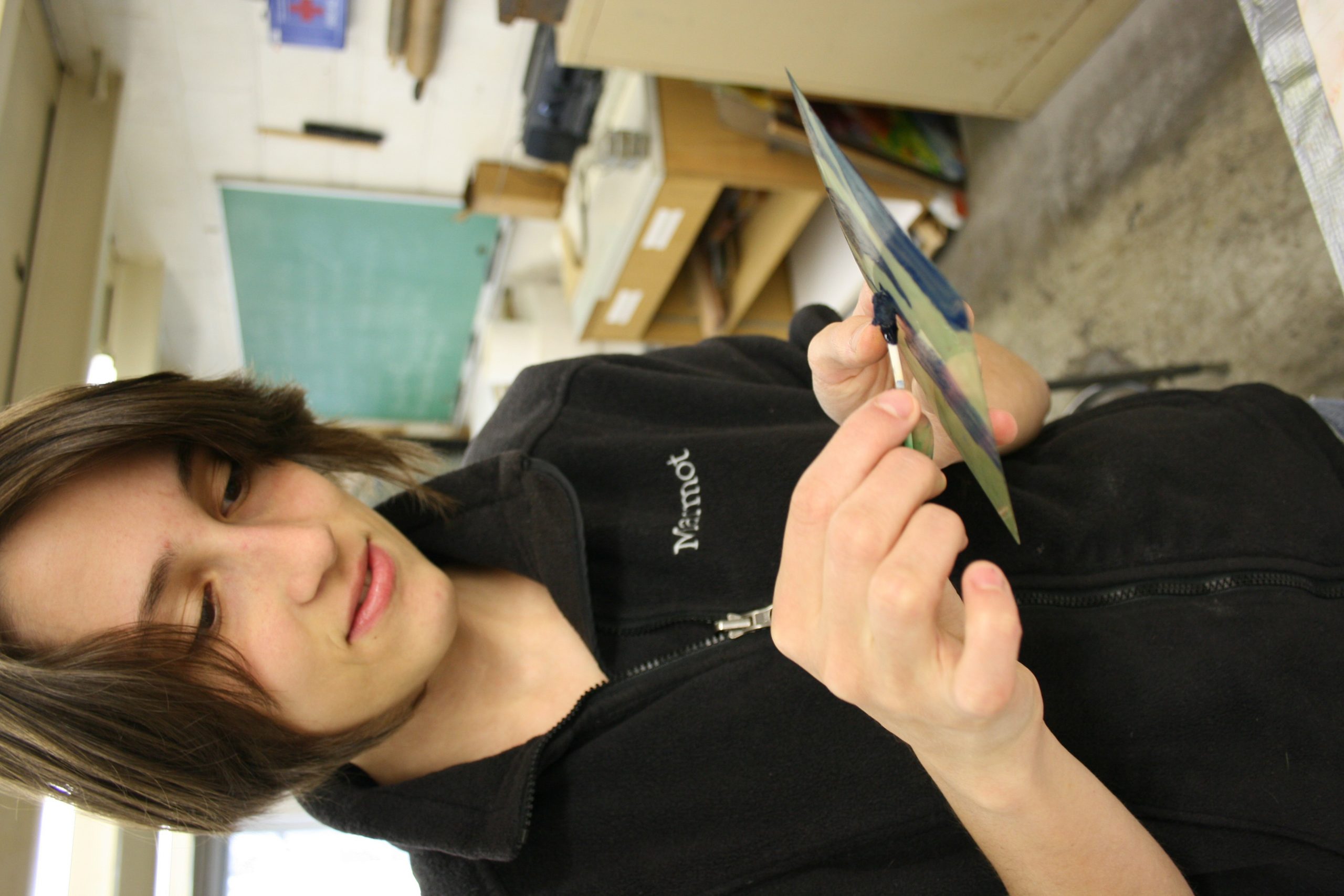 In Printmaking class, students work mainly with black, oil-based inks. Beth, however, wanted to experiment with color. “These inks are water-based, which means they are healthier and easier to clean up,” said Glick.Starting with a clean Plexiglass plate, Glick chooses her first background color and inks it on with a brayer. Next, she dampens her paper, pats it dry and prints the plain-color plate. Choosing a contrasting color ink, Glick applies her design with a cotton-swab. “I decided to go with a nature theme. Sometimes I use real leaves and ink them into a print.”