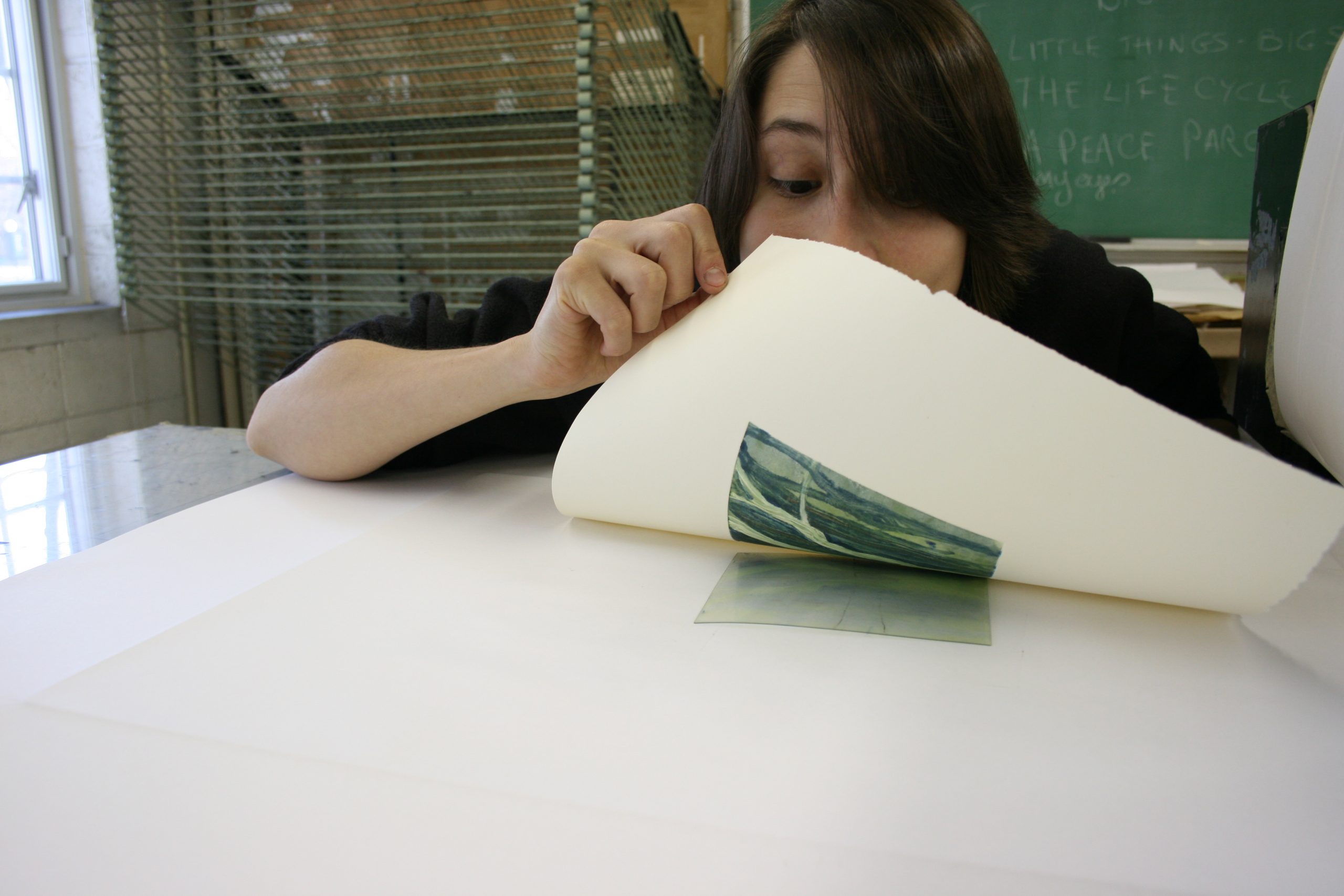 Beth lays her paper onto the rolling press, and carefully positions the plate a second time on top of the first image. Then, she folds the padded “blankets” on top, and with a heave, turns the crank until it rolls through.